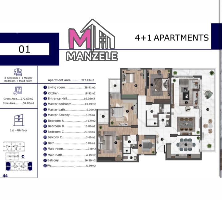 نوع الوحدة : شقة 4+1(4 غرف نوم + صالة ) الطابق : متوفرة في الطوابق من الأول إلى الرابع. المواصفات العامة : تفاصيل الوحدات والمساحات : . الصالة المطبخ . مدخل القاعة . غرفة النوم الرئيسية (ماستر) . الحمام الرئيسي . شرفة الغرفة الرئيسية . غرفة نوم 1 . غرفة نوم 2 . غرفة نوم 3 . غرفة نوم 4 . شرفة الغرفة 3 . الحمام المشترك . حمام 2 . الشرفة الرئيسية (بالكون) . حمام الضيوف