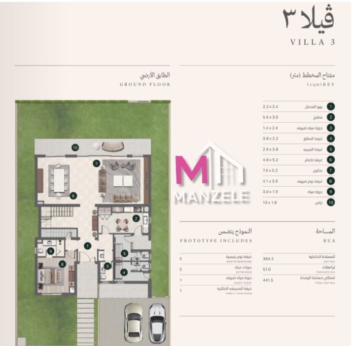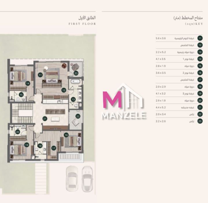 5 غرف نوم (تشمل الرئيسي وغرفة الضيوف).