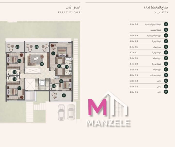 • 4 منها في الطابق الأول (تشمل الجناح الرئيسي) + 1 غرفة ضيوف في الأرضي.
